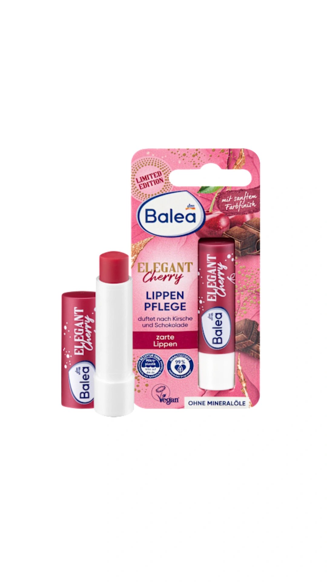 Balea’s Elegant Cherry lip balm combines nourishing shea butter with a subtle tint for a pampered lip experience. The creamy texture provides supple care and prevents lips from drying out. With a delicate cherry and chocolate scent, every application becomes a moment of indulgence. A light tint gives lips a fresh and natural look while keeping them optimally protected and cared for. Ideal for everyday use and for anyone who wants a fruity-chocolatey lip care experience. Formula free of microplastics and water-soluble, purely synthetic polymers.